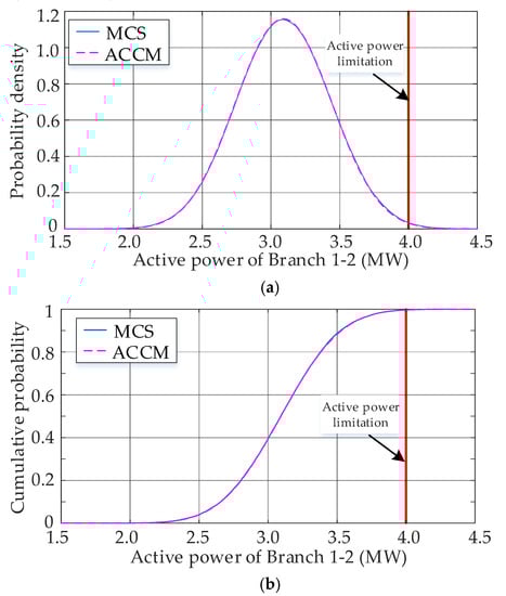 In period 48, the DGs outputs are relatively low while the load demands are high. Most of the power is supplied through the tie-line between the distribution network and the main grid. Therefore, line 1-2 is the most stressed and may experience the risk of overload. Figure 13 presents he probability distributions of the active power of branch 1-2 are obtained from ACCM and MCS. The results indicate that the distributions obtained by the proposed method close to the reference curve. The performance of the proposed method in fitting the tail of the probability distribution can be verified by calculating rare events. Therefore, we assume that 4 MW is the limitation of the active power of Branch 1-2. Under such circumstances, the risks of overload obtained by the proposed method and MCS are 0.0037 and 0.0039, respectively. The results demonstrate that the proposed ACCM has high accuracy in estimating the tail regions of distributions.