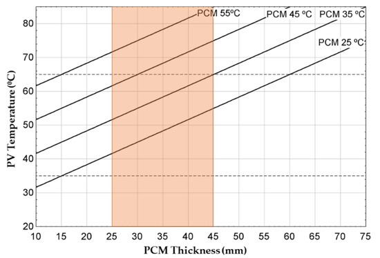 The low thermal conductivity of a PCM prohibits the use of large thicknesses. Studies conducted on PCM thickness indicate thicknesses of 30 mm as a useful limit value [24]. Figure 1 shows the variation in the temperature of the PV panel with a PCM of variable thickness or melting point, considering the solid-state thermal conduction of the PCM, and assuming one-dimensional conduction, according to Fourier’s Law (1).