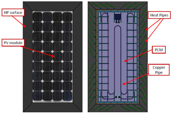 The panel described in this work has four different elements: PV panel, PCM, heat pipes, and thermal collector. The starting point is a conventional flat photovoltaic panel, which simplifies the construction and can be adapted to any type of standard geometry. This element is responsible for absorbing solar radiation and generating electricity. The PCM attached to the back can therefore be used to control panel temperatures and store heat during daylight hours, that in this design, can be increased over 30 mm, due to better heat transfer.
