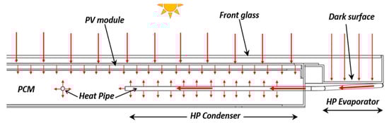 These elements are arranged in contact with the black perimeter of the panel surface where they absorb heat and transfer it to the PCM. The working temperature of the HP can be slightly higher than that of the PV panel, as they are at a slight distance from the PV and will not produce a temperature increase in the PV cells until all the PCM is molten. Energy will only be stored as sensible heat when there is an increase in the PCM temperature. The operating scheme can be seen in Figure 3, where the heat flux to the PCM, that takes place in the proposed design, is schematized.