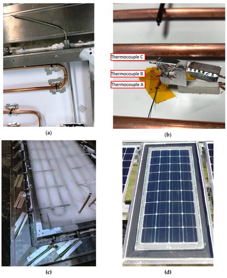 Several K-type thermocouples, distributed along a diagonal of the panel, at three different heights separated , were included inside the PCM in order to verify the correct operation of the design, as shown in Figure 4b. These measures allow the characterization of the PCM melting process during operation. Figure 4d shows the front glass that entraps the layer of air for thermal insulation of the front of the panel.
