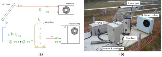 Hydraulic Scheme (a) and image (b) of the outdoor testing facility for PV/T panels.