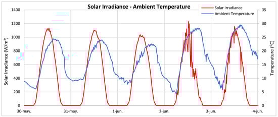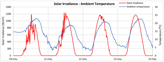 The first tests on the panel were in the month of May, when partially cloudy and clear days were registered. Figure 6 shows the solar radiation and temperature of those days. The first two days were partially cloudy while the other days were clear. The ambient temperatures of those days reached values higher than 20 although, during the night, the temperature dropped to values close to 5 °C. These temperatures are not extreme conditions, although at night the lower temperature increases the heat that is dissipated. These tests were carried out with a water flow of 2 during the central hours of the day, between 10:00 a.m. and 8:00 p.m.