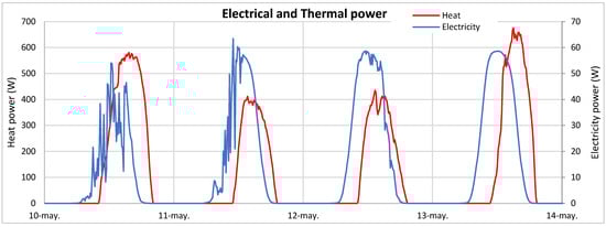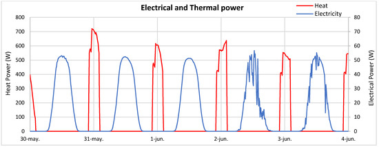 As previously mentioned, in this working configuration, the fluid pump was active for several hours of the day. In this way, heat was only obtained from the panel during those hours. The values of heat and electricity generated by the panel over the different days are represented in Figure 7. Electricity generation was similar every day, except for the first day that was cloudier and therefore with lower levels of solar irradiation. On the other days, the solar radiation was very similar, reaching peak values higher than . Likewise, the temperature of the PV panel was similar, with a maximum value of , except for the first cloudier day when the solar energy was lower and therefore its temperature. Under this configuration, the PV panel was able to generate 790 of electricity in a day with a peak power close to .