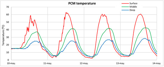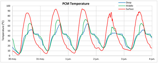 The PCM melting process is shown in Figure 8 where the temperatures within the panel are represented for the three depths of the PCM. The red line is the temperature variation of the surface temperature on the PV panel. It is observed that, during every day of operation, the maximum temperature, close to , and its variation is very similar. This temperature was sufficient to melt the PCM, so much so that the PCM close to the PV panel was molten. In contrast, lower PCM temperatures showed lower temperatures. None of them reached the melting point of . The volume of molten PCM was between the back surface of the panel and the first thermocouple. Molten temperatures were reached as heat was removed during the day, leaving the PCM refrigerated throughout most daylight hours. In this mode of operation, although the fluid temperature was warmed to only , the electricity generation was greater.
