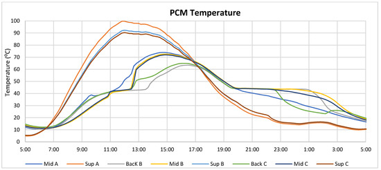 When the temperatures of all thermocouples placed inside the PCM are plotted, see Figure 12, it can be seen that the temperature was not homogeneous at each depth. There is a temperature gradient between the upper and lower zone of the panel, the differences between which at some points exceeded 10 .