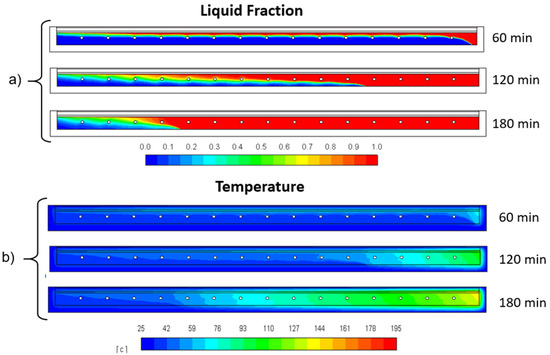 Evolution of the phase change process and the temperature in the PCM. Study conducted in CFD. (a) Liquid fraction (b) Temperature. (Note: simulations at a panel inclination of 42 °C).