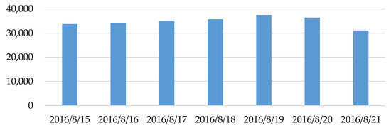 The bicycle-sharing data employed in this study are derived from Mobike, the world’s largest shared bicycle operator [35]. From 15 August 2016 to 21 August 2016, 243,864 transaction records had been achieved in this seven-day period. On every weekday, the daily shared-bicycle transaction record is up to over 35,000. Table 1 shows an example of the original bicycle-sharing data, from which we find that a completed transaction record contains spatiotemporal information (i.e., time and coordinates) on both trip origin and trip destination. Figure 2 and Figure 3 demonstrate the bicycle-sharing usage at the daily and hourly level, respectively. Detailed analyses on the temporal variations of the bicycle share ridership are provided in the following sections.