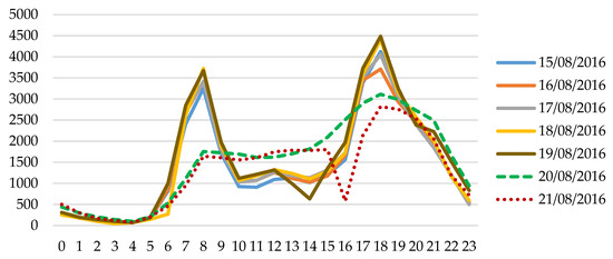 However, when it comes to the hourly distribution, the Wilcoxon signed-rank test shows that the temporal variation between weekdays and weekends is pronouncedly different (Table 3). From Monday to Friday, no significant variation is reported. This result is also in accord with what is shown in Figure 3. However, with respect to Saturday (20 August 2016) and Sunday (21 August 2016), the results turn out to be quite dissimilar with weekdays. Both Saturday and Sunday show a distinctive temporal distribution compared to the other six days. In comparison with Sunday, Saturday to a certain extent demonstrates a more alike temporal distribution with the weekdays.