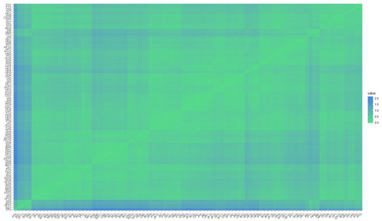 Firstly, Figure 4 shows the distance between each pair of subdistricts. As distance value decreases from blue to green, an obvious blue belt located at the bottom demonstrates this group of subdistricts is quite distant from or dissimilar to other subdistricts in terms of urban vitality performance. This group contains YP8, BS3, YP11, BS1, and YP5. Particularly for YP5, it has a notable blue stripe in contrast with most of the other subdistricts, demonstrating its unique performance of urban vitality. In addition, there are also some other blue stripes in Figure 4, such as BS4 and PT1. Some green patterns also need to be noted, as the low distance values that reflect those corresponding subdistricts could be clustered into a group.
