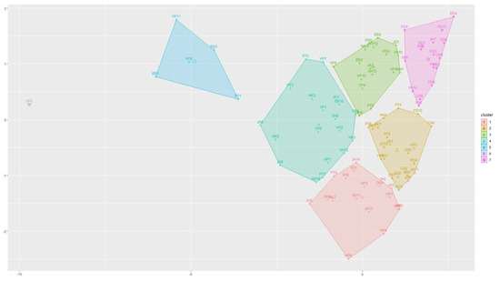 Secondly, grounded in the results of the paired distance, Figure 5 reveals the exact clustering of those subdistricts. It shows that the 98 subdistricts are partitioned into 7 clusters with different colours. Five of them (cluster 1, cluster 2, cluster 3, cluster 4, and cluster 7) are relatively close to each other, demonstrating that those subdistricts have a relatively similar performance of urban vitality. While, the other two clusters, cluster 5 and cluster 6, are located in isolation. Similar to the results in Figure 4, YP5, one subdistrict representing one cluster, is found to be quite distant to other subdistricts. Cluster 5, containing five subdistricts (YP8, BS3, YP11, BS1, and PT1), is shown to sit in the intermediate zone between YP5 and the other clusters with distinctive urban vitality among the 98 subdistricts.