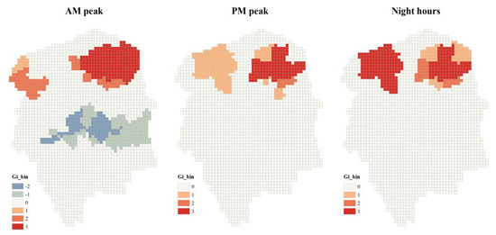 As Table 4 presents the result of spatial autocorrelation at different time periods, what stands out in the table is that the spatial clustering of urban vitality is not fixed over the course of a day. During AM peak, it shows a significant clustered spatial distribution due to the results of Moran’s Index and p-value, while during Midday off-peak hours, Moran’s Index is near 0 and the p-value is not small enough to reject the null hypothesis. Thereby, the urban vitality during this time period is randomly distributed across the study area, and neither clustering nor dispersion can be verified. With respect to PM peak and Night hours, the spatial clustering is found to emerge again. By comparing the value of the z-score, the spatial clustering is shown to be strongest during AM peak and becomes weakest during PM peak.