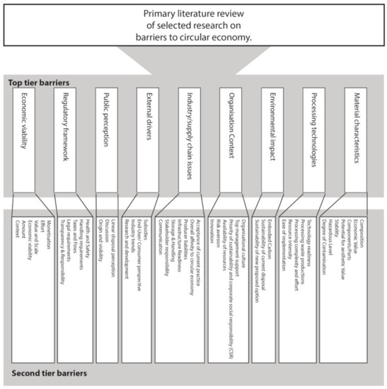 Based on this previous recent work and from analysing the barriers to specific materials and end of life products, the barriers identified by other workers have been re-grouped thematically [29,37,39,40,41,42]. This has produced a set of nine primary barriers, and these have been used in the assessment method developed in this work. These nine top-tier barriers have sufficient granularity to avoid generalisation, but cover the key aspects relevant to defining the CE potential of materials and end of life products. The primary barrier categories selected are: