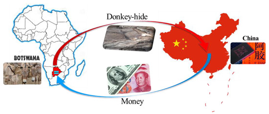 The literature on the trading of biodiversity has largely focused on wild species. Very little attention has been paid to the increasing consumption of livestock and its impacts on their sustainability. Recently, the demand for donkey hides in China has increased resulting in donkey population decline globally [3,4]. The global population of donkeys is estimated to be 40–46 million donkeys [3]. Donkeys in developing countries are valued as working animals. However, the roles and economic values of donkeys have changed greatly over the years. The demand for donkey hides in China has triggered a global trade of donkeys. The donkey hides are used to produce one type of traditional medicine, ejiao. A British-based charity, The Donkey Sanctuary, has estimated that China’s demand for donkeys is about 10 million annually. Many countries in Africa export donkey hides to China. Sub-Saharan Africa exports about 1.8 million donkey hides to China annually [4]. For individual countries, South Africa has a legal annual export quota of 10,500 donkey hides to Hong Kong and mainland China, but the real quantity is higher, as smuggled donkey hides are frequently reported [5]. In Nigeria, donkey-hide trade has been seen as a lucrative business with the potential for making quick cash, with 3000 donkeys sold per week by dealers [6]. In Kenya, a $6 million USD Chinese-operated slaughterhouse in Baringo has been slaughtering hundreds of donkeys a day [6].
