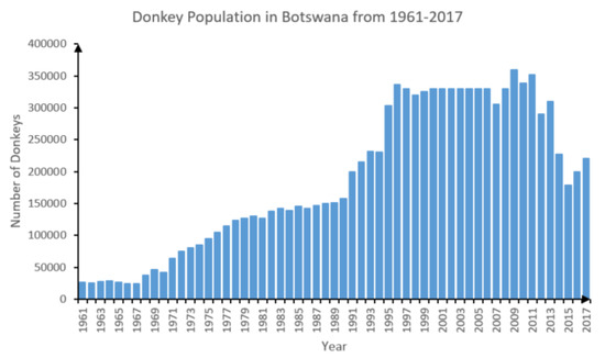 Botswana is a beef country, exporting much of its beef to the European Union. As the demand for donkey hides in China increased, Botswana discovered a niche in the donkey market in 2016, and allowed export of live donkeys, their meat, and hides to China. However, the available statistics of the donkey population and donkey hides are unreliable. The discrepancy in the statistics of slaughtered donkeys is largely associated with illegal export and smuggling of donkey hides. The Government of Botswana estimated that the country had a population of 366,000 donkeys in 2008 [26]. Data from FAO shows that the donkey population in Botswana has increased from 1971 to 2009, then declined to a record low in 2015 to nearly half of the population in 2009 (Figure 2) [3]. The donkey population has declined by 37% between 2011 and 2017 [27].