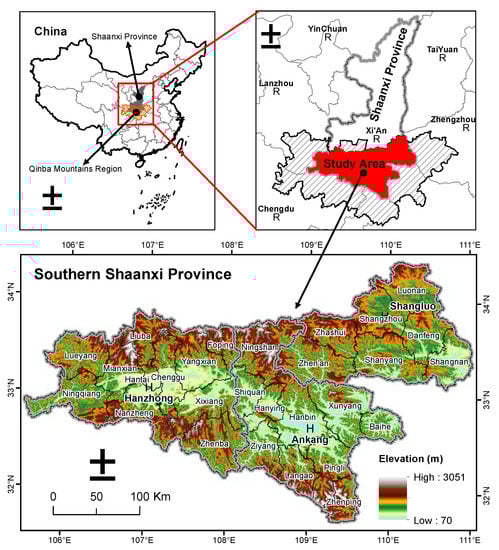 The study area (31°42′–34°45′, 105°46′–111°15′) is the southern Shaanxi Province, China, that belongs to the Qinba Mountains region with the Qinling Mountains in the north and the Bashan Mountains in the south (Figure 1), and is also the primary water source of the MRSNWTP. The study area includes Hanzhong City, Ankang City and Shangluo City from west to east, respectively. The total area is approximately 7.026 × 104 km2, accounting for about 35% of the total area of the Shaanxi Province. The climate type in the region is the north subtropical monsoon climate area in the western part, and is the excessive area of the north subtropical and warm temperate zone. The average annual temperature is 12–15 °C and the annual precipitation is 700–1300 mm. The main land-use areas are about 6.19 × 104 km2 for woodland, 6.69 × 103 km2 for agricultural land, 1.26 × 103 km2 for construction land, and 183 km2 for water body, respectively, the natural forest area accounting for 45.1% of the total area. Crops (i.e., maize, wheat and rice), economic forests, sparse woods, and mixed needle and deciduous broadleaved types characterize the primary land uses [16].