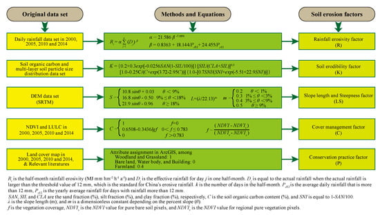 Referring to the methods of evaluating soil erosion by the RUSLE model of previous researches [4,6], all five factors of the RUSLE model in this study were calculated in the environment of GIS software with the calculation methods or equations of five factors detailed in the flowchart of data processing (Figure 2).