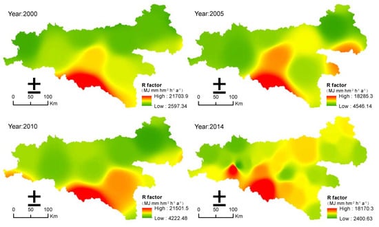 Rainfall erosivity map in 2000, 2005, 2010, and 2014.