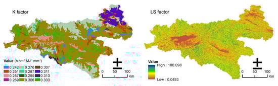 Soil erodibility factor (K factor) and slope length and steepness factor (LS factor) map of the southern Shaanxi Province.