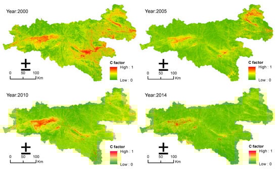 Cover management factor (C factor) map of the southern Shaanxi Province in 2000, 2005, 2010, and 2014.