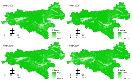 The conservation practice factor (P) was the most difficult determination factor in RUSLE [21]. Referring to relevant literatures, the study used land use and cover maps of different periods in the study area to roughly determine the conservation practice factor by an attribute assignment method in the ArcGIS 10.2 software, and obtained the spatial distribution maps of the conservation practice factor of the study area (Figure 6).