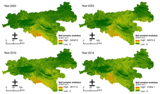 Soil erosion modulus of the southern Shaanxi Province in 2000, 2005, 2010, and 2014.