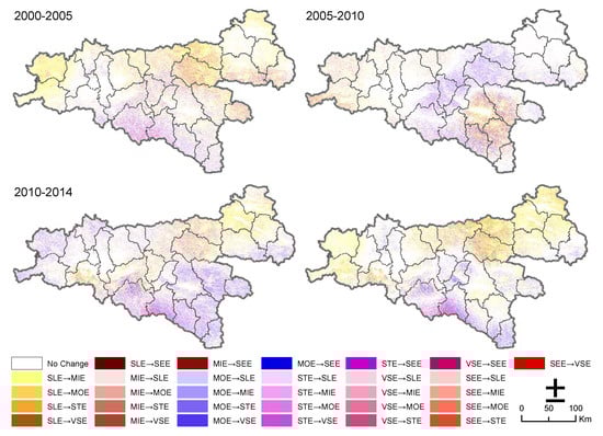 The change maps were obtained by overlaying the soil erosion intensity images of 2000, 2005, 2010, and 2014. The resultant change maps displayed “from–to” the soil erosion intensity changes (Figure 8). In the period of 2000 to 2005, the soil erosion intensity area of regions with no changes (NC), increases, and decreases was 45,214.52 km2, 18,753.33 km2 and 6257.12 km2, respectively. The proration of the increased region accounted for 26.70% of the total area and was approximately three-fold more than that of the reduced region. The region with an increase was primarily because of the transfer from slight erosion to mild erosion and mild erosion to moderate erosion with the proration of 59.26% and 32.66% of the total increased region area, respectively. Additionally, the erosion was distributed in seven counties with an area percentage greater than 55% of the total increased region area, i.e., Zhen’an, Lueyang, Ningshan, Zhashui, Shanyang, Ningqiang and Xunyang. The reduced region was primarily because of the transfer from mild erosion to slight erosion, moderate erosion to mild erosion, and strong erosion to moderate erosion with the proration of 47.15%, 35.19%, and 11.62%, respectively. It was also primarily distributed in seven counties with an area percentage greater than 60% of the total reduced region area, i.e., Zhenba, Ziyang, Hanbin, Nanzheng, Pingli, Langao, and Xixiang.