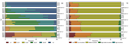 Distribution and changes of each soil erosion intensity levels in different slope gradients (a) and in different elevation gradients (b).