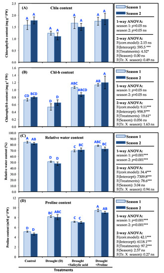 Effect of salicylic acid and proline on chlorophyll a and b concentrations (A,B), relative water content (C), and proline content (D) in barley plants under drought stress during two growing seasons: season 1 (2017/2018) and season 2 (2018/2019). Data represented as mean ± SE); differences between treatment groups were assessed by one- and two-way ANOVAs. Bars with different letters are significantly different according to Tukey’s HSD at p < 0.05. * Significant at p < 0.05; ** highly significant at p < 0.01; *** very highly significant at p < 0.001; NS, nonsignificant at p > 0.05.