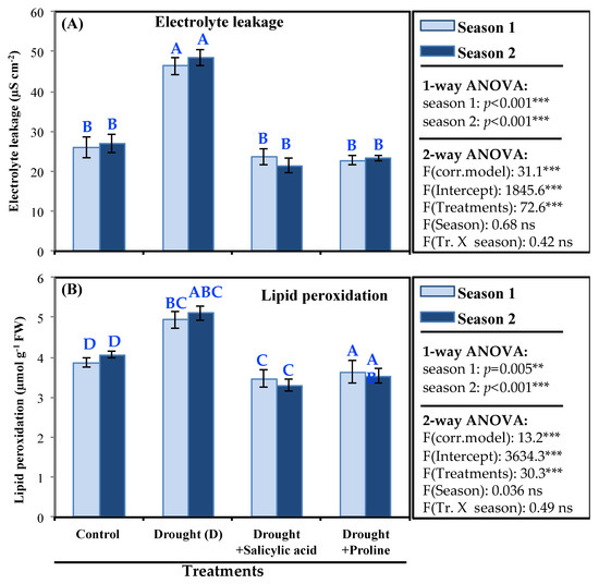 The effects of either proline or SA treatments on relative water contents and proline content in barley are presented in Figure 1C,D. Drought caused significant reduction (p < 0.05) in relative water content (58.3% ± 1.35 % and 53% ± 3.11%) in both seasons, respectively; nevertheless, the maximum values (81.5% and 84%) were recorded in control plants. Additionally, proline and SA treatments led to significant increase in relative water content (RWC; 72.5% and 74.6%, and 76% and 78.2%, respectively) in both seasons compared with stressed untreated plants (Figure 1C). From Figure 1D, it could be observed that water stressed-plants showed significant increase in proline contents (7.4 and 7.9 mM g−1 FW) compared with control plants (5.2 and 4.5 mM g−1 FW) in the two seasons, respectively. Interestingly enough, proline contents were enhanced with application of proline and SA; the maximum values (9.6 and 9.1 mM g−1 FW) were obtained with proline treatment in both seasons. Exposing plants to drought stress led to increased electrolyte leakage (43% and 41.5%) in the two seasons compared with control and the treated stressed plants with proline and SA (Figure 2A). Our results indicated that application of proline and SA led to decreased electrolyte leakage (EL) in stressed treated plants (21% and 24%, and 25% and 23.5%) in both seasons, respectively; the best result was obtained with stressed treated plants with SA. As a response of drought, data presented in Figure 2B indicated that drought stress significantly increased lipid peroxidation (MDA) (5 and 5.2 μmol g−1 FW) compared to control plants (3.9 and 4.2 μmol g−1 FW) in both seasons, respectively. However, application of proline and SA treatments significantly decreased lipid peroxidation (3.5% and 3.6%, and 3.6 and 4.7 μmol g−1 FW) compared to stressed untreated plants in the two seasons.