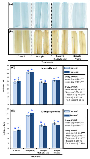 The presented data in Figure 3 revealed that accumulation of hydrogen peroxide and superoxide in stressed plants was higher than control plants and other treatments (Figure 3A,B). Likewise, concentrations of O2·- and H2O2 were increased significantly in water-stressed plants (39 and 43, and 34 and 35) compared with control plants (28 and 30, and 17 and 18) in the two seasons, respectively. Conversely, foliar application of proline and SA led to decreased concentration of O2·- (27 and 30, and 28 and 33) in both seasons and concentration of H2O2 (21.5 and 23, and 25 and 27) in the two seasons, respectively (Figure 3C,D).