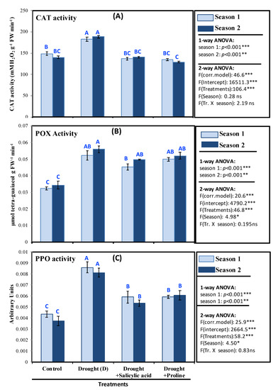 In the current study, the results showed that CAT, POX, and PPO enzyme activities were increased significantly by exposure to drought stress (Figure 4A,C). CAT activity was increased significantly (176.4 and 181 mM H2O2 g−1 FW min−1) in stressed barley plants compared with control (149.6 and 142.8 mM H2O2 g−1 FW min−1) in both seasons (Figure 4A). However, application of SA led to improved CAT activity (139 and 146.5 mM H2O2 g−1 FW min−1) in both seasons; likewise, proline led to improved CAT activity (142.6 and 127.8 mM H2O2 g−1 FW min−1) in compared to control in the two seasons. Correspondingly, proline and SA treatments led to improve POX and PPO activities in barley plants under drought conditions in both seasons (Figure 4B,C).