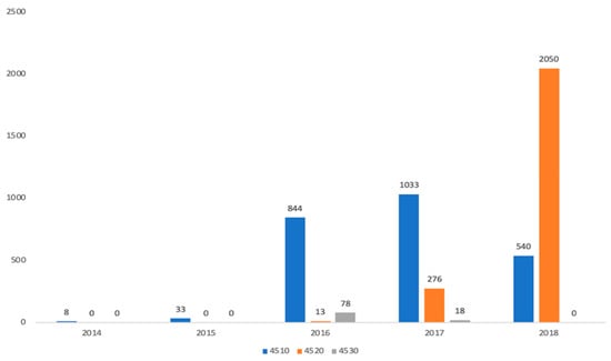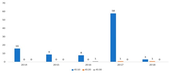 For analyzing a patent of blockchain and firm value, we collected publicly available archival data from the United State Patents and Trademark Office (USPTO) and Compustat database for matching financial data. The data collection followed two steps. First, we collected total patents of blockchain data by keyword searching (e.g., blockchain, blockchain technology) in the USPTO database from 2013 to 2019. In total, we collected 784 patents of blockchain from the USPTO. We set the patents of blockchain year by the patents’ filing year for handling long lags between the granted year and application year [11,31]. Second, we collected each firm’s financial data that are listed in the patents of blockchain.