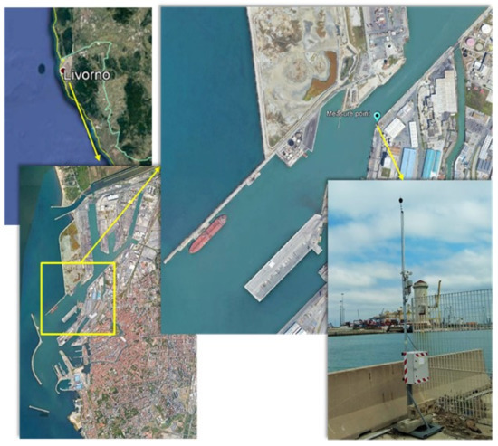 The work was based on an extremely long-term measurement of noise performed from 24th May 2018 to 5th September 2018 at a quay along the “industrial canal” of the port of Livorno, one of the largest in Italy. With its annual traffic capacity of about 36 million tons of cargo and 748,000 TEUs (twenty-foot equivalent unit) in 2018, the port of Livorno is also one of the largest ports in the Mediterranean Sea. The canal where the measurements were carried out represents the only access for all kind of vessels inward and outward from the industrial port area. Thus, all kind of ships, from Lift-on/lift-off (LOLO), RORO, container ships, and ferryboats to smaller vessels like tugboats and pilot boats that passed in front of the measurement position could be registered.