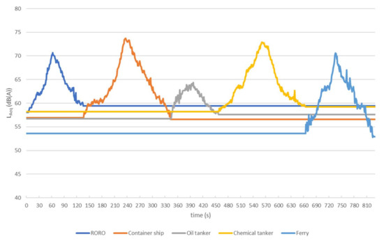 The acquired data partly fulfilled the BS EN ISO 2922:2000 + A1:2013 [59] requests, such as no reflecting surfaces were present within 30 m around the vessel and the microphone, the height above water was approximately 4 m, the passages taken into account had the maximum of the level at least 6 dB over the background noise, in most cases even 10 dB above, and a sea state lower than 3 for all passages considered. However, some other prescriptions of the standard could not be applied to the present experimental setup for several critical points, such as the course of the sailing vessels was not under the authors’ control, the distance of the sound level meter from the vessel side was variable because of the variable widths of the sailing vessels (from 15 m to 40 m), and it was not possible to keep the spread of the sound level indicator lower than 3 dB because of ship and distance variability. It should be said that the ISO aims to provide specifies for acceptance and monitoring test vessels in test sessions, proving compliance with noise specification or prescribed limits and checking that no noticeable changes have occurred. In a real case scenario, the ISO was not applicable.