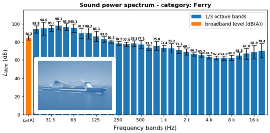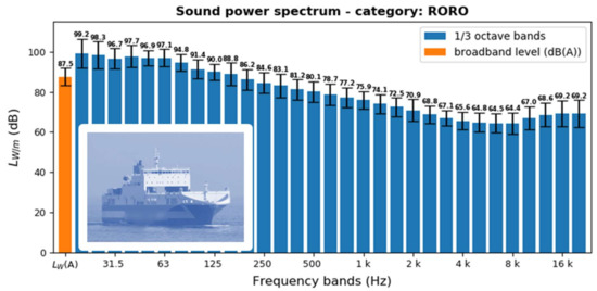 The present paper reported the sound power level and 1/3 octave band sound power spectrum of five categories of ship: RORO, container ships, oil tankers, chemical tankers, and ferries. The results, with uncertainties, were obtained using data coming from a specific long-term noise measurement performed for more than three months along the route ships follow to enter the industrial port of Livorno (Italy). A weighted sound pressure level, sound spectrum, and the duration of each pass-by were joined with the corresponding type of vessel taken by surveillance cameras of the Port Authority and from the ships’ information telematics system portals. With the so built database of each pass-by, the average LW/m and 1/3 octave band sound power spectrum information were computed for each of the five categories.