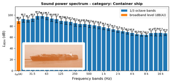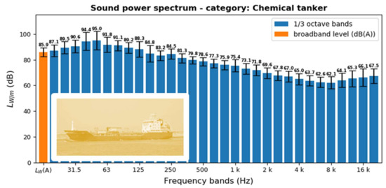 Container ships were the category with the highest sound power level, while oil tankers were the lowest, with almost 7 dB(A) less.