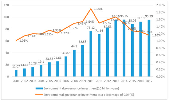Investment in environmental governance and its share of GDP. Data Source: China Statistical Yearbook 2002–2018.