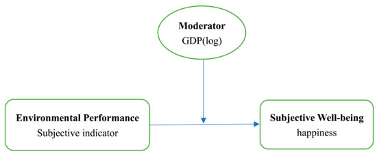 Therefore, in investigating the relationship between environmental performance and happiness, the effects generated by economic development need to be addressed. In this article, we treat the GDP variable as a moderator to mirror the various effects of environmental performance on subjective well-being. We won’t take GDP as a mediating variable to examine the relationship between economic development and environmental protection. We argue that as GDP increases, the positive effects of environmental performance on subjective well-being will decrease, based on the notion that the public has a high expectation of happiness in those places where GDP is high [28,29], and low expectations when GDP is low. Normally, a high GDP brings with it a good quality of education and a public that is more critical towards public affairs. In other words, the high expectation pertaining to happiness will lead the public not to be easily satisfied with the current status, meaning that their standards of happiness will also be raised by their high expectations. As shown in Figure 2, environmental performance directly influences subjective well-being, and this effect will be moderated by the variable GDP.