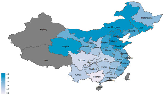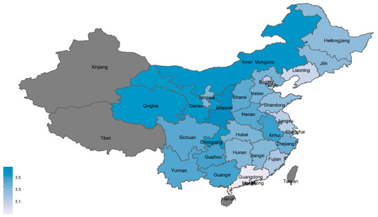 Distribution of Environmental Satisfaction. Note: Gray areas represent the missing values; the darker the shade of blue, the more satisfied the participants reported feeling. Source: Map generated on the data from CGSS2015.