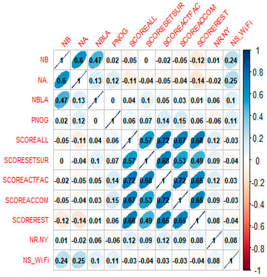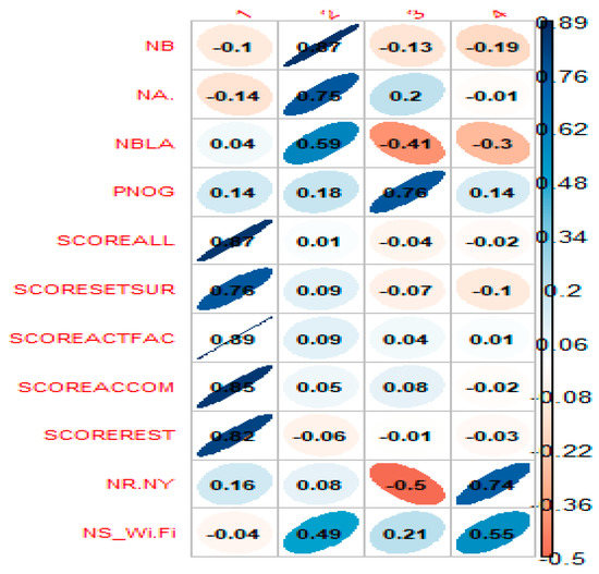 The results of the correlation analysis (Figure 1), show that the overall evaluation from visitors (SCOREALL) of farmhouse attributes was generally, positively correlated with SCOREACTFAC (0.72), with SCOREREST (0.68), with SCOREACCOM (0.67) and less so with SCORESETSUR (0.57). NB is linked positively with NA (0.6). In contrast, NB and NA show a low correlation with NS_Wi.Fi, equal to 0.24 and 0.25, respectively. These correlations shed some light on the possible links between the original variables from which the PCs derived, which are likely to show a subsequent merging of those variables showing stronger correlations. Another relevant observation is that, on the one hand, the negative relationship between the PNGO and the presence of a website with customer review data suggests that if the PNGO increases, the number of written reviews decreases. On the other hand, it is clear that the NS exerts little influence on the PNGO. Consequently, NS is not considered as important as the environmental and landscape features of the surrounding areas, so that the costs of maintaining the aesthetic qualities of the landscape probably are internalised in the price of staying in the FFEF.