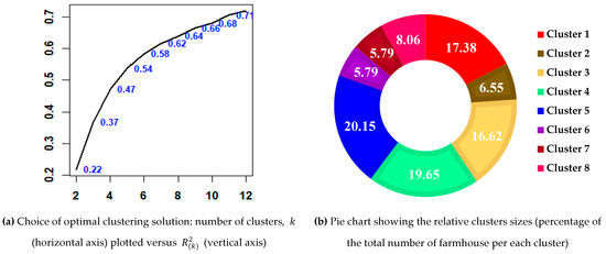 In the second step of the analysis, HCA was adopted to identify which forms of farmhouses were suited to which types of visitors (RQ3). Based on the 4 PCs extracted in the previous step—PC1: the “visitor evaluation scores”; PC2: the “dimensionality attributes”; PC3: the “value factor”; PC4: the “consolidated website and services farmhouse”—a HCA with Ward’s method (see Section 3.2) was carried out too. The choice of the optimal number of clusters followed the “elbow method”, and Figure 3a shows an elbow at the 8 cluster solution, with the resulting subdivision accounting for 62% of the total variance. Figure 3b reports the percentage composition of the cluster numerosity.