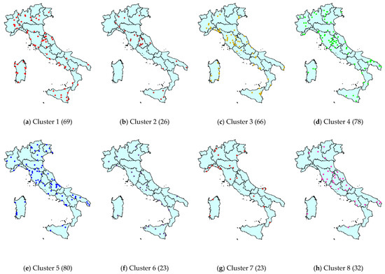 Territorial distribution of the 8 clusters (Figure 4a–h; cluster sizes in brackets).