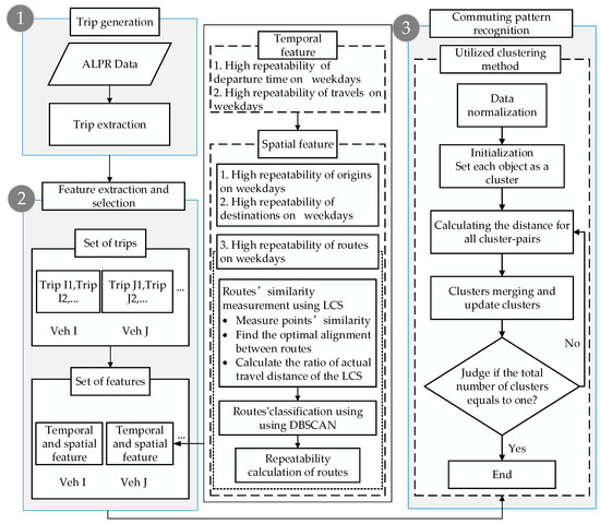 Recently, with the emerging big data technologies [13], the commuting pattern at an individual level can be efficiently derived using advanced data-driven methods (e.g., machine learning) [14,15,16,17,18,19,20,21,22,23,24,25,26,27]. Various kinds of data were utilized in these data-driven based methods, including Global Positioning System (GPS) data, mobile phone call detail records (CDRs), smart card data and remote sensing imagery [14,15,16], which provide new sights for traffic control-oriented applications. Zhou et al. [17] proposed a density-based clustering method to quantify the spatial distribution of O-D (Origin-Destination) demands of urban traffic using GPS data. Kung et al. [18] compared different commuting patterns using mobile phone data and concluded that home-work time distributions and average values within a single region are largely independent of commuting distance or country. Altintasi et al. [19] investigated the arrival and departure of car-based commuting behavior on campus using Radio Frequency Identification technology (RFID). Ma et al. [20] developed a series of data mining methods to identify the spatiotemporal commuting patterns of Beijing public transit riders using smart card data. McNeill et al. [21] explored the extent to which local commuting patterns can be estimated from data drawn from Twitter and concluded that the Twitter data offer a good proxy for local commuting patterns, etc. [22]. Generally, the commuting flow can be effectively derived with various sources of data, and the commuting pattern was revealed in a much finer spatial and temporal scale. Recently, with the widely use of automatic license plate recognition (ALPR) data, many studies investigated the commuting pattern based on license plate matching. Chang and Yang [23] analyzed the temporal and spatial distributions of the commuting vehicles based on the ALPR data. Chen et al. [24] used a K-means clustering algorithm to extract the commuting travel vehicles based on ALPR data. Our previous study [25] estimated the O-D patterns using vehicle trajectory data collected by ALPR devices and investigated the temporal-spatial distribution patterns of trip generation and attraction, etc. [26]. With detailed information, large sample size, and real-time data availability of ALPR data [28], these studies highlighted their potentials in individual level traffic pattern recognition. Basically, these data-driven studies added empirical evidence to commuting pattern recognition from different aspects with a series of data mining methods. However, commuters’ route features are not considered or not accurately characterized among these studies. As commuters tend to select several familiar routes for work/home, the route feature plays an important role in identifying commuters. It is of great importance to accurately characterize the route features for commuters’ pattern recognition. Besides, few studies focused on an implementation framework for commuting pattern recognition which is important for engineering applications. Specifically, with the increasing of commuting demands, commuting pattern recognition becomes more important for making suitable traffic control measures [2]. Considering the implementation of commuting pattern recognition, a systematic framework which can be easily utilized in different engineering applications is needed.