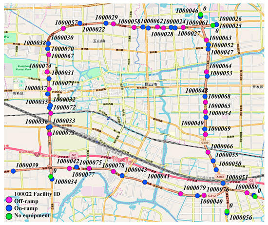 A ring expressway with 35 on-ramps and 24 off-ramps in Kunshan City, China was selected as the test site (as shown in Figure 2). As the selected network is a closed ring expressway network, the vehicle path can be determined by an origin and a destination. Therefore, only the origin and destination information were used to describe the spatial features of a traveler. The ALPR devices were located at on-ramps and off-ramps of the selected network.