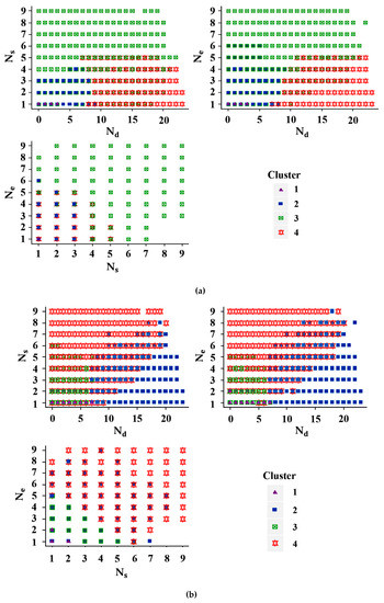 As shown in Figure 4, the commuters’ features were clustered into four clusters using Hclust and K-means, respectively. As introduced in Section 2.2, commuters tend to recur repeatedly (large ) during the fixed duration, a fixed origin (smaller ) and a fixed destination (smaller ) for multiple weekdays. Based on this, the Cluster 4 in Figure 4a and the Cluster 2 in Figure 4b were considered as the identified commuting vehicles and the other Clusters were labelled as non-commuting vehicles.