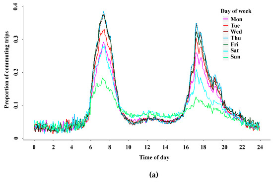 In terms of the temporal pattern, the time-of-day, day-of-week and day-to-day ratio of commuting trips of the test site was analyzed, respectively. The temporal commuting pattern was expressed as the average ratio of commuting trips at a specific duration. The ratio of commuting trips was considered as the proportion of commuting trips in the total number of trips at a period of time. For example, the time-of-day commuting pattern at different days of the week was derived as the average ratio of commuting trips at different days of the week.