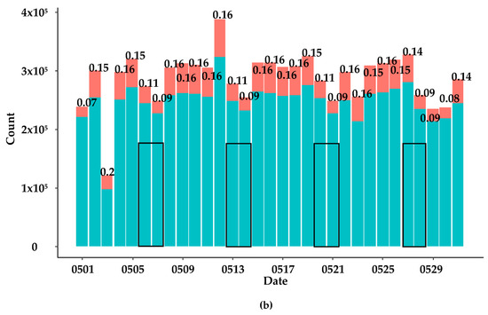 Figure 5a describes the average ratio of commuting trips every 5 min at different days of the week. It was shown that the overall ratio of commuting trips at morning peaks was larger and more concentrated compared to those at evening peaks. The reason is that the departure time at evening peaks is more flexible than that at morning peaks. Part of the commuters may go shopping or have dinner outside after work. Furthermore, the temporal commuting pattern was similar from Monday to Saturday, and the ratio of commuting trips at some peak hours of the weekdays reached 0.4. Besides, the daily traffic demands and their structure are shown in Figure 5b. The red and green rectangles describe the number of commuting and non-commuting trips, respectively. The labels are the ratios of commuting trips in a whole day. It shows that the ratio of commuting trips is relatively stable around 0.16 per day and the traffic demand is smaller on weekends (marked with black rectangles).