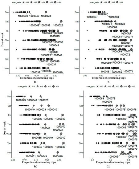 To further analyze the spatial commuting pattern, the location-varying ratio of commuting trips at days of the week were investigated in the morning and evening, respectively. The spatial commuting pattern in the morning and evening were derived by averaging the ratio of commuting trips before and after 12:00 on different days of the week for each device. Figure 8a,b depict the ratio of commuting trips of each device in the morning for on-ramps and in the evening for off-ramps. Similarly, Figure 8c,d depict the ratio of commuting trips for each device in the evening for the on-ramp and in the morning for the off-ramp, respectively. The ALPR devices installed at on-ramps were labelled from “1000022” to “1000056,” and the rest were installed at off-ramps. The large points with labelled numbers were the devices with the top three highest ratios of commuting trips at corresponding mornings/evenings on different days of week, which were considered to be frequently used ramps.