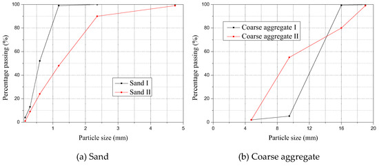 Concrete used to fill the steel tube included PAC and NC which were all composed with Ordinary Portland Cement, coarse aggregate, sand, water reducing agent and tap water. The grade of Ordinary Portland Cement was 42.5 (GB 175-2007 [41]). The chemical compositions of Ordinary Portland Cement were presented in Table 2. The details of properties of coarse aggregate, sand and water reducing agent were summarized in Table 3. The coarse aggregate I and sand I were utilized to prepared PAC, while the coarse aggregate II and sand II were utilized to prepared NC. The particle size distribution of sand and coarse aggregate were presented in Figure 1. The mix proportions of NC were designed according to the JGJ 55-2011 [42] as shown in Table 4. The mix proportions of PAC were ascertained according to the following principles: coarse aggregate filled molds in a state of loose accumulation and the mortar was used to fill the void between coarse aggregate. After a series of tentative experiments, the mix proportions of PAC were confirmed as illustrated in the Table 4. The compressive strength of NC and PAC were all measured by three cubic specimens of 100 mm × 100 mm × 100 mm following the GB/T 50081-2002 [43]. The yield strength, ultimate strength and elastic modulus of steel tube were tested in accordance to GB/T 228-2010. The test results of properties of steel tube, NC and PAC were presented in Table 1.